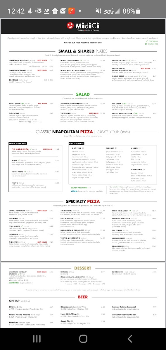 If you’re curious about what makes Midici The Neapolitan Pizza Company Menu worth exploring, it all starts with the dough. Fired in a traditional oven and blistered just right, the pizzas lean into that soft, airy crust with simple but bold toppings - think fresh burrata, bright San Marzano tomatoes, and silky prosciutto layered with intention. The classics are there, of course, but there’s also a playful side to the menu that keeps things interesting.
