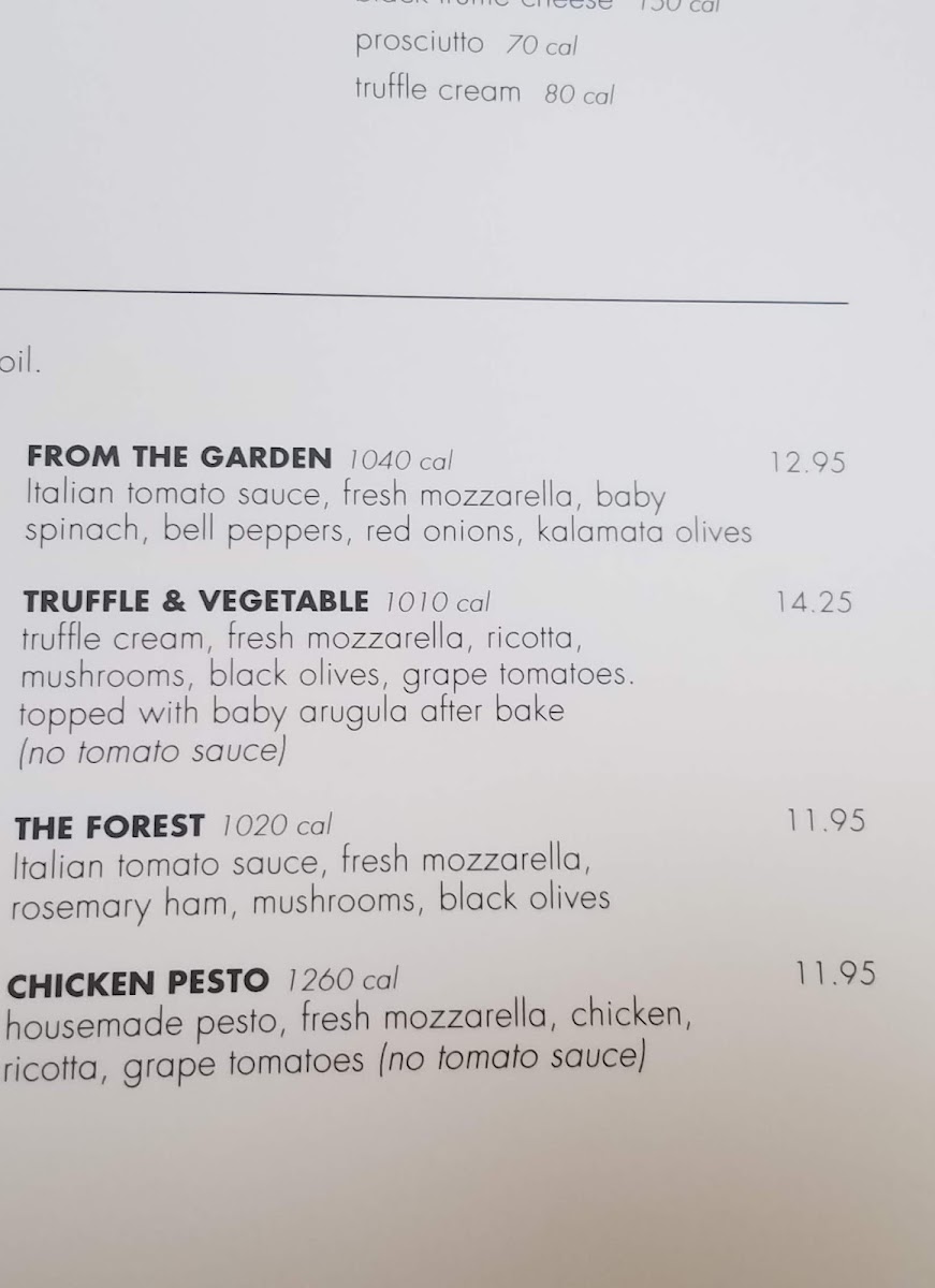 Truffle cream, fresh mozzarella, parmesan, basil, extra virgin olive oil (no tomato sauce)